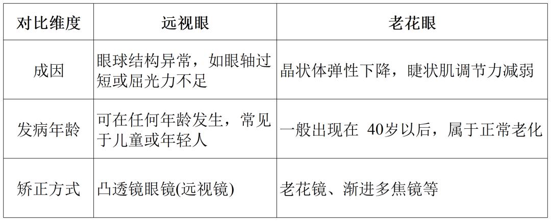 虽然远视和老花都会让人“看近不清晰”,但它们的本质截然不同。从产生机制到矫正方法,两者存在诸多关键差异,具体可详见下表: