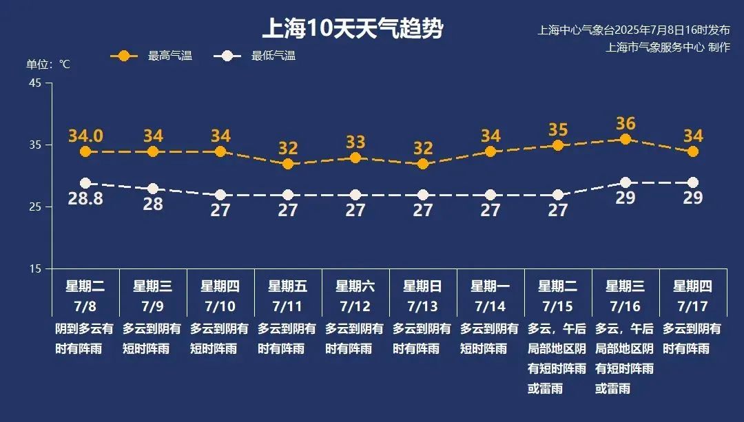 下半周,上海处于副热带高压边缘,受偏东气流影响,多阵雨天气。气温波动较小,最低气温27 - 28℃,最高气温32 - 34℃。出门记得携带晴雨伞,既能遮阳又能挡雨。