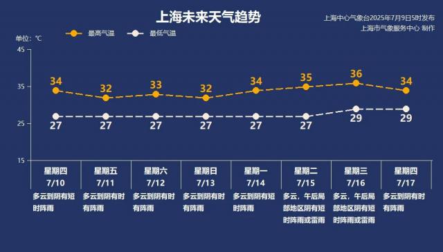 本周下半周申城处于副热带高压边缘,受偏东气流影响,多阵雨天气,气温起伏小,整体在27 - 34℃。虽未达高温线,但体感不佳,防暑降温时要注意防范突然降水,晴雨伞可常备。