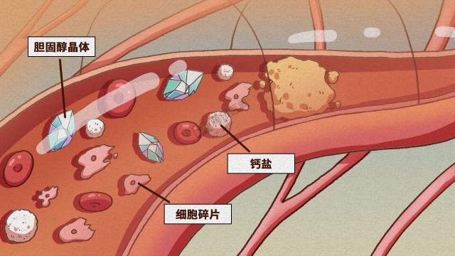 它们变成泡沫细胞,开始收集胆固醇。同时,平滑肌细胞也从动脉中层跑到内皮下。胆固醇晶体、细胞碎片、钙盐等“捣乱分子”聚集在一起,开始“作妖”。