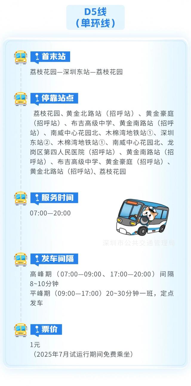 @龙岗区南湾街道的小伙伴们,为了让你们少走点路,深圳市东部公交正式开通了荔枝花园环线 D5 线。重点来啦,2025 年 7 月乘车免费哦(试运营结束后就恢复收费啦)。