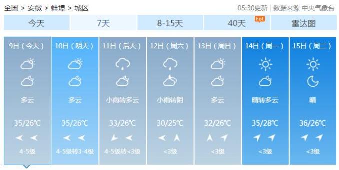 来看具体预报,据蚌埠市气象台最新预报,预计未来7天,13日前我市多阵雨或雷雨天气,11 - 12日最高温度33℃,12日最高温度30℃。