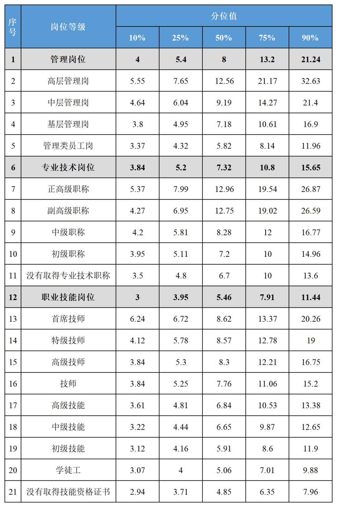 从岗位来看,工资价位中位数管理岗位>专业技术岗位>职业技能岗位,分别为8万元/年、7.32万元/年、5.46万元/年。但其中专业技术岗位正高级职称(12.96万元/年)和副高级职称(12.75万元/年)略高于高层管理岗位(12.56万元/年)。