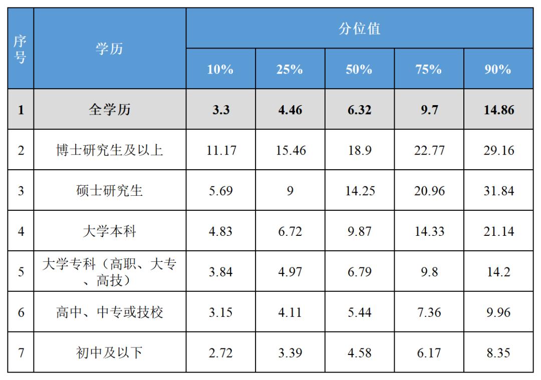 从学历工资价位来看,工资价位中位数依次为博士研究生及以上18.9万元/年,硕士研究生14.25万元/年,大学本科9.87万元/年,大学专科(高职、大专、高技)6.79万元/年,高中、中专或技校5.44万元/年,初中及以下4.58万元/年。学历与从业人员的工资报酬水平成正相关。
