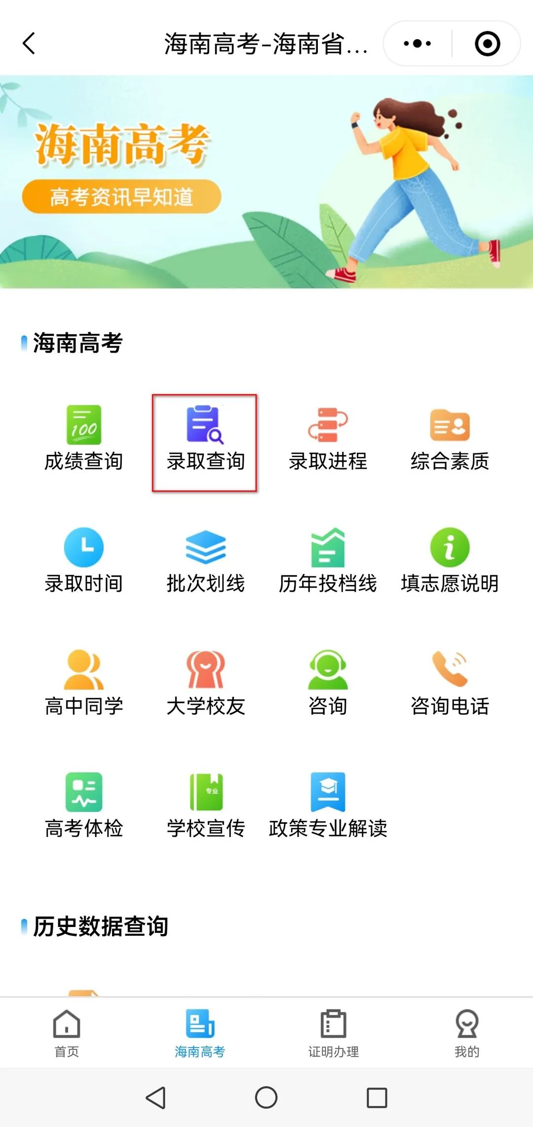 可通过海南省教育厅或海南省考试局官方微信平台查询。考生可进入海南省教育厅官方微信公众号“海南省教育厅”(微信号:hnsjytwx)或海南省考试局官方微信公众号“海南考试”(微信号:hnkswx),点击“高考专栏”菜单下的“海易办高考专栏”内的“录取查询”模块进行查询。