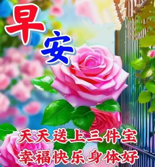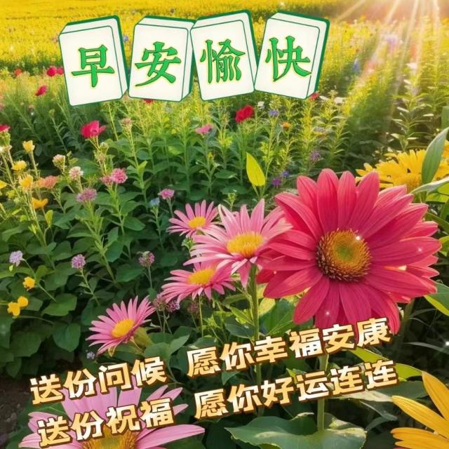 美丽的一天,从美好的开始!请收下我这份诚挚的祝福!希望你在未来的日子里:一帆风顺,二人同心,三羊开泰,四季平安,五福临门,六六大顺,七窍玲珑,八方来财,九转功成,十全十美!收到这份祝福,你一定会健康、幸福、快乐!大家早上好!