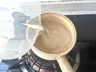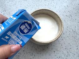 将椰浆、牛奶、糖倒入锅中搅拌均匀,小火加热至冒泡,稍微放凉到50℃左右。