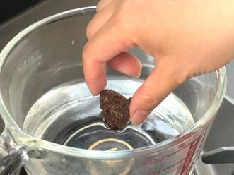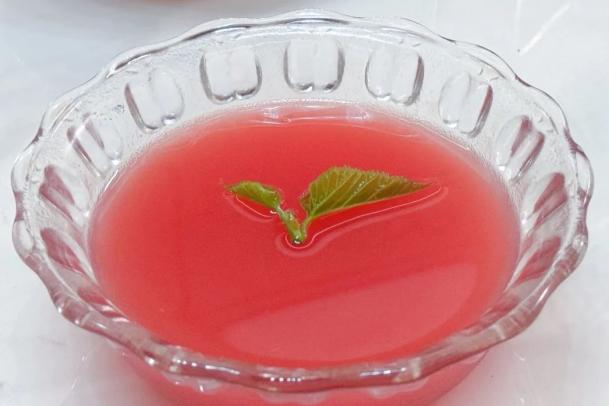 糖块放入水中,再加入薄荷叶,熬出薄荷糖水,最后将凝固好的西瓜酪淋上糖水即可享用。