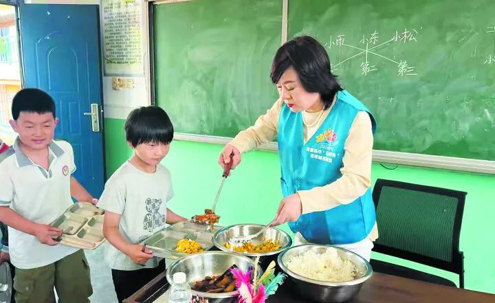 李秋杰在爱心厨房里为孩子们盛饭菜。 (图片由文苑百鑫志愿者服务队提供)