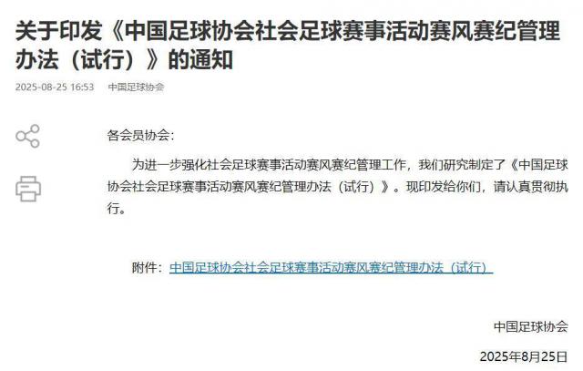 然而,8月25日中国足协发布的《中国足球协会社会足球赛事活动赛风赛纪管理办法(试行)》引发了广泛讨论。该办法旨在加强社会足球赛事的纪律管理,涵盖赛事组织、违规处罚等多方面。规定对于殴打、谩骂裁判员以及故意延误比赛等行为,将实施取消参赛资格、禁赛等处罚,个人最高禁赛5年,单位可能被暂停或取消办赛资格。
