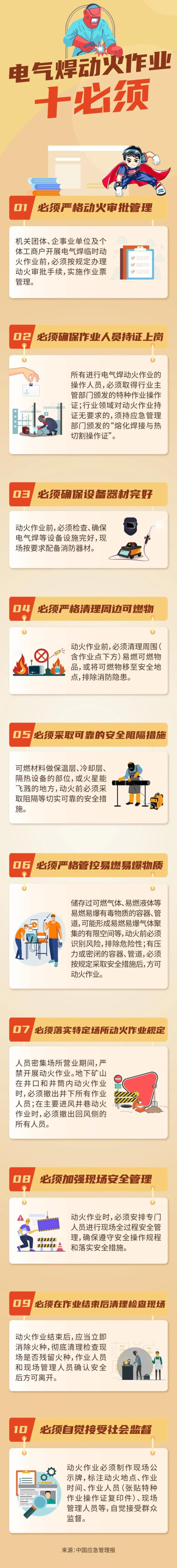 违规电焊气割作业一旦引发事故,将严重危及生命财产安全。相关工作人员应时刻保持警醒,经专门培训合格后持证上岗,严格遵守电气焊作业“十必须”,向违规动火作业说“不”,预防和减少事故发生!