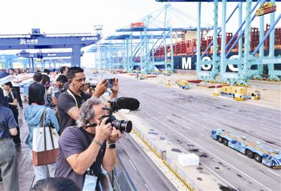 看到码头上无人却一片繁忙,外媒记者纷纷架起摄像机、拿出手机记录。印度尼西亚《迪斯威日报》主编多安·维迪安多诺表示:“我首次来到天津港,之前主要报道东亚地区尤其是中国,很关注东亚和中国的技术发展。此次来这,众多自动化技术和现代化港口给我留下深刻印象。我希望自己的国家能进一步利用这些技术,与中方达成长期技术支持合作,共创美好未来。”