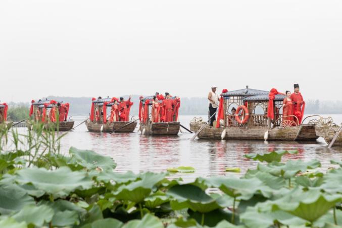 新人身着中式礼服,踏着红毯在白洋淀边缓步入场,盟誓成礼。集体婚礼将传统婚俗的庄重与雄安青年的浪漫相融。婚礼仪式遵循传统礼仪,有奉三拜礼、饮合卺酒、行结发礼等环节,让新人们感受到婚姻的神圣和责任。