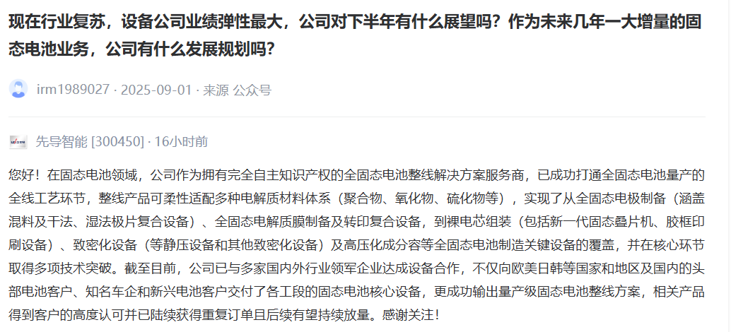 消息面上,9月4日,先导智能在投资者互动平台表示,在固态电池领域,公司作为拥有完全自主知识产权的全固态电池整线解决方案服务商,已成功打通全固态电池量产的全线工艺环节,订单有望持续放量。