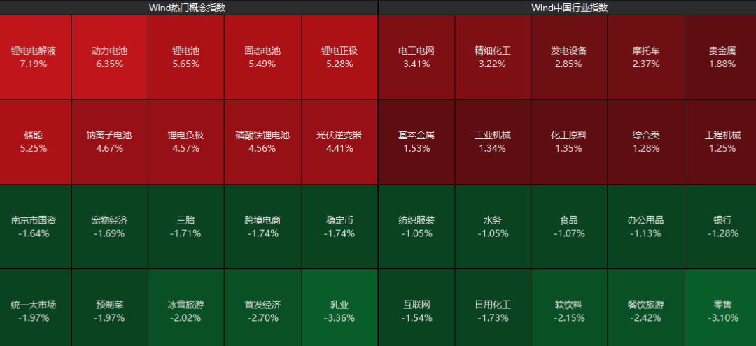 从板块表现来看,锂电、固态电池概念股集体呈现走高态势,化工、贵金属、储能等板块也表现活跃;而零售、餐饮旅游、银行等板块则跌幅居前。