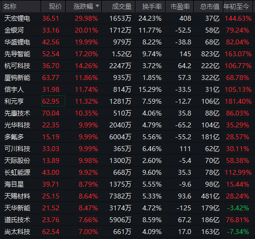 此外,锂电板块持续走强,天宏锂电30%涨停,光华科技、多氟多、天际股份等多股涨停。