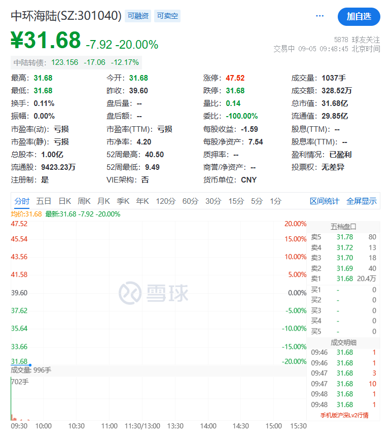 9月5日,中环海陆开盘即跌停,截至发稿,该股报31.68元/股,跌幅为20%。