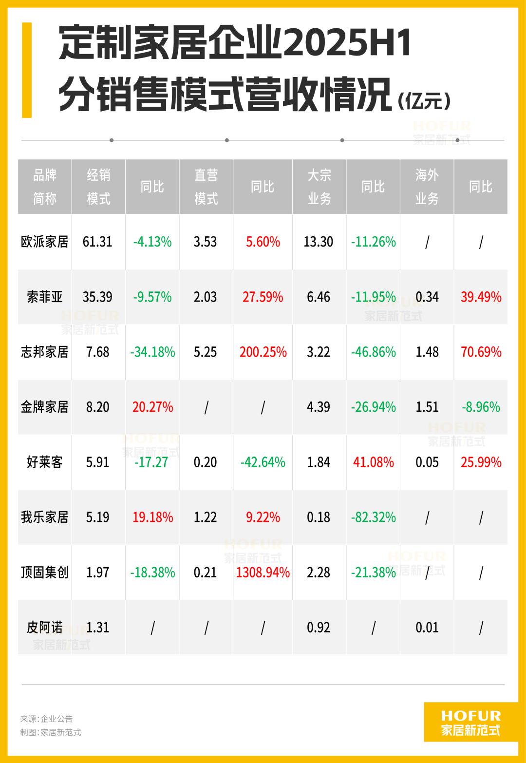 与经销渠道形成鲜明对比的是,直营渠道和海外市场表现亮眼。顶固集创自2024年发力的直营渠道,今年上半年增幅达1308.94%。索菲亚直营渠道营收同比上涨27.59%至2.03亿元,志邦家居直营渠道营收达5.25亿元、增幅200.25%,欧派家居直营渠道营收已达3.53亿元。