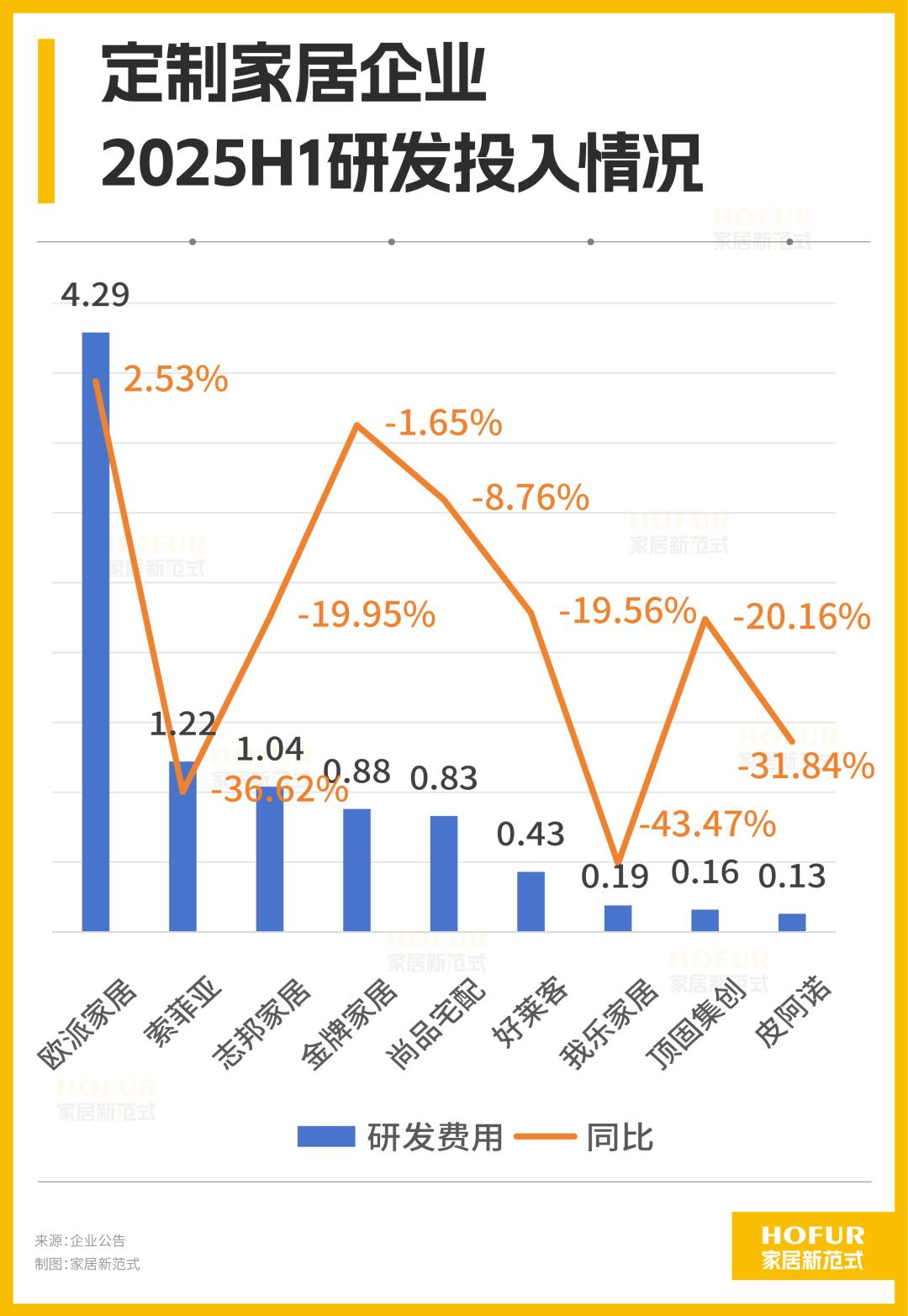 研发投入方面,多数企业大幅缩减。唯有欧派家居研发费用同比微增2.53%至4.29亿元,显示出其对技术创新的持续重视。其余企业研发增幅均为负,其中我乐家居上半年研发投入下滑幅度最大,缩减了43.47%至0.19亿元。
