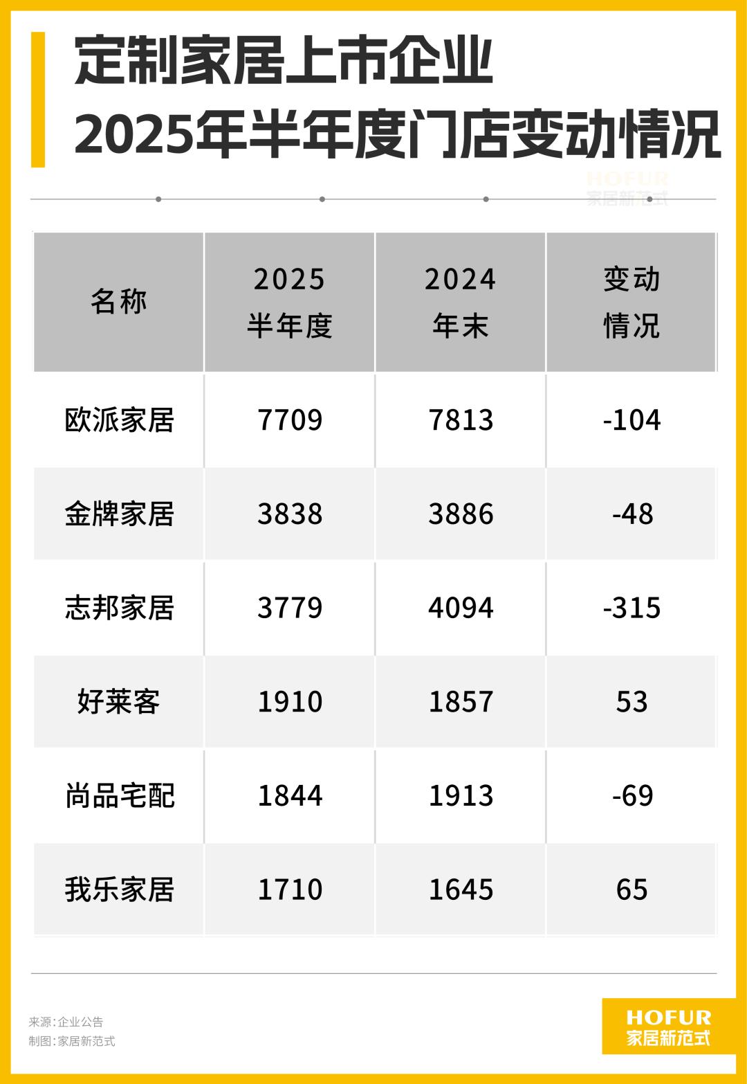 具体到门店数量,截至报告期,多数企业门店数量减少。志邦家居和欧派家居整体门店数量分别较2024年末减少315家和104家,而我乐家居和好莱客分别净增65家和53家店。由此,行业格局发生变化,金牌家居门店数超越志邦家居,好莱客也超越了尚品宅配。