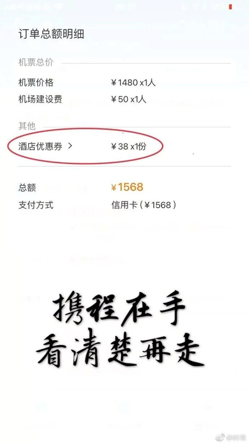 2017年,演员韩雪也发文称多次手动取消订票信息里的“预选保险框”,还是被套路。她晒出的机票总额明细中含38元酒店优惠券,还提醒网友“携程在手,看清楚再走”。
