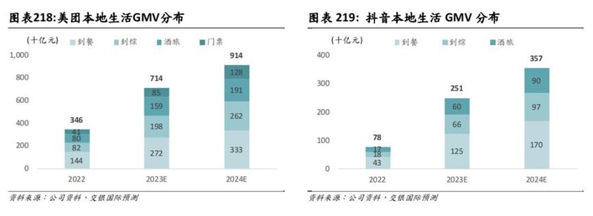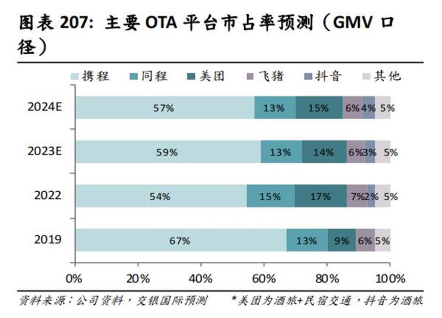 抖音在OTA赛道成绩不俗。2023年,用户观看酒旅直播总时长同比提升206%,酒旅直播支付GMV同比增长200多倍。交银国际预测2024年抖音酒旅GMV为900亿元,约为美团的28%。