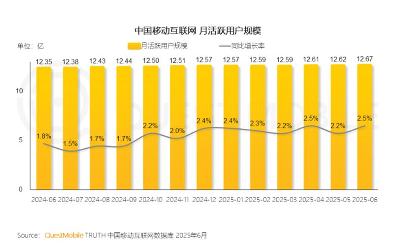目前,中国移动互联网流量红利耗尽。2025年6月,月活规模12.67亿,同比仅增长2.5%,近一年月同比增速徘徊在2%左右。