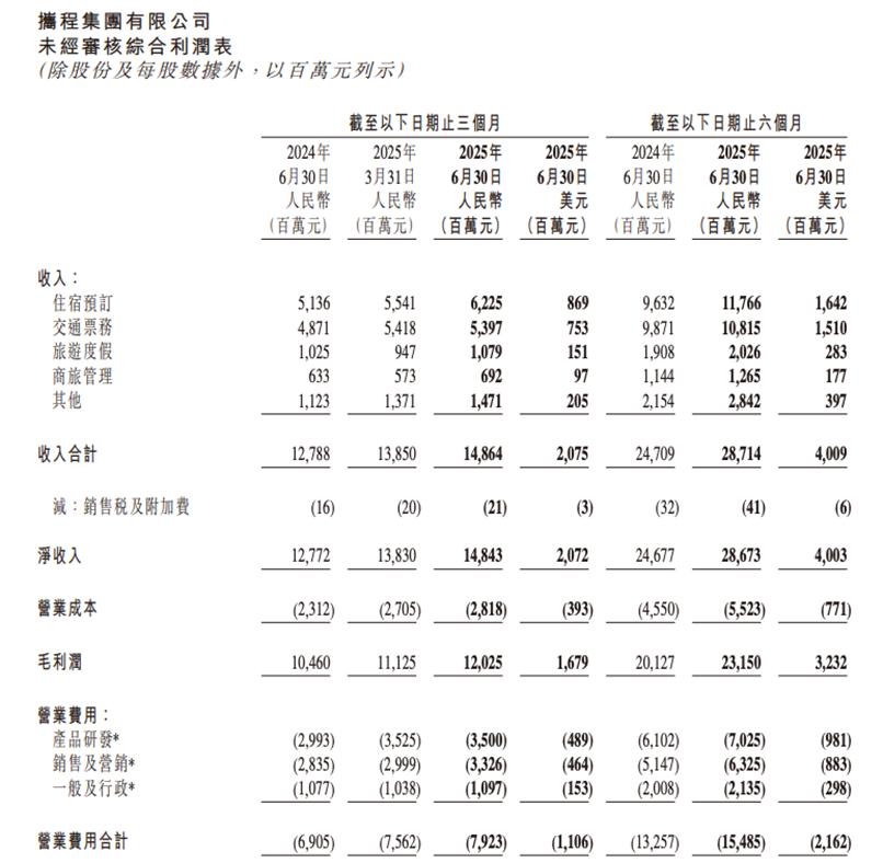 2025年Q2,携程业绩全面增长。住宿预订收入62亿元,同比增长21%;交通票务收入54亿元,同比增长11%;旅游度假收入11亿元,同比增长5%;商旅管理收入6.92亿元,同比增长9%。