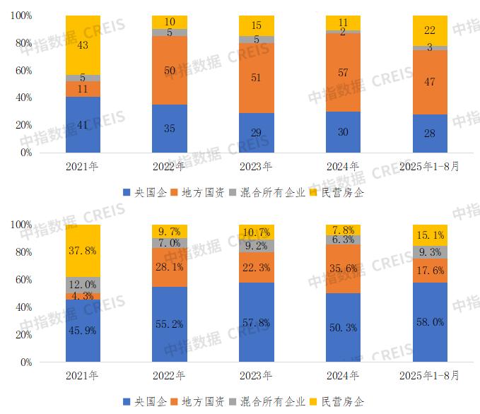 拿地力度分化明显,头部央国企积极补仓,部分企业拿地意愿依旧较低,较为审慎。2025年1 - 8月,销售额TOP50企业拿地销售比均值为31.2%,较2024年同期提升16.1个百分点,不同性质企业、不同阵营企业拿地销售比均高于去年同期,整体来看,拿地意愿强劲。分阵营来看,TOP10企业拿地销售比远超其他阵营;分企业所有制性质来看,央国企拿地销售比高于民企和混合所有制企业,当前头部央国企已经成为土拍主力、开发市场的顶梁柱。