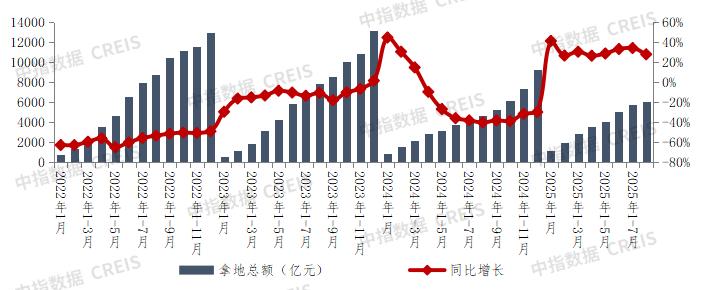 图:2022年1月 - 2025年8月TOP100房企累计拿地总额及同比