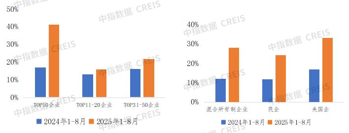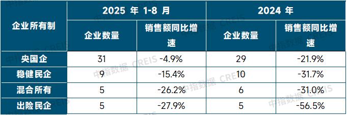 从企业所有制来看,央国企销售表现仍有一定优势。2025年1 - 8月,销售额前50企业中央国企数量增加2家至31家,销售额同比下降4.9%,好于其他类型企业;销售额前50企业中混合所有制企业失速,销售额同比降幅与出险民企接近。