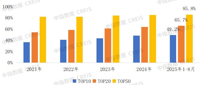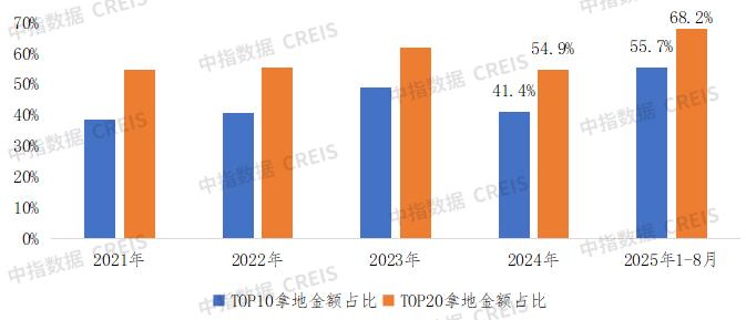 图:2021 - 2025年1 - 8月TOP100中TOP10企业、TOP20企业拿地金额占比