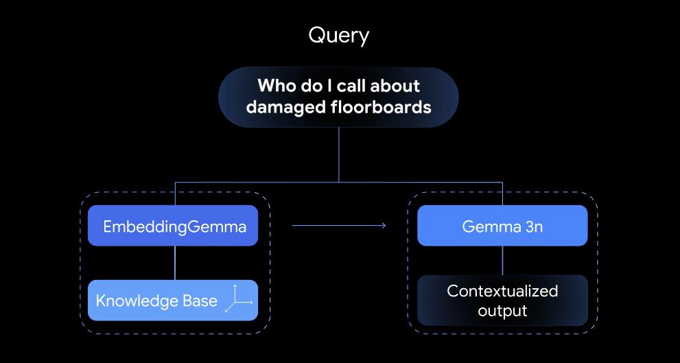 随后,用户可将这些文本片段与原始查询一同输入生成式模型(如Gemma 3),从而生成符合上下文的相关答案。例如,模型能理解你需要联系木工的电话以解决地板损坏的问题。