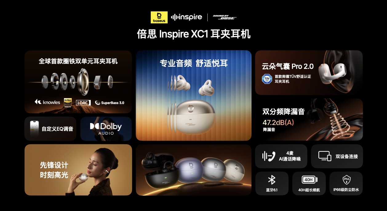 倍思Inspire XC1耳夹耳机备受关注。它全球首发搭载楼氏动铁单元,频响延伸至40kHz,高频听感清澈;配合三磁路高灵敏动圈单元,低音表现出色。双单元分频协作,全频段精准还原。经Sound by Bose专业调校,支持音质均衡,传承Bose经典听感,还支持Hi-Res金标认证与LDAC高清解码,结合Dolby音效,打造沉浸声场,可能是行业音质最强的耳夹耳机。