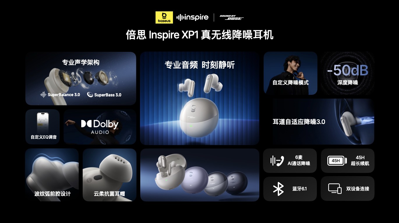 倍思Inspire系列包括头戴式耳机、真无线降噪耳机和开放式耳夹耳机三大品类,是对年轻消费者核心消费场景需求的全场景解答。
