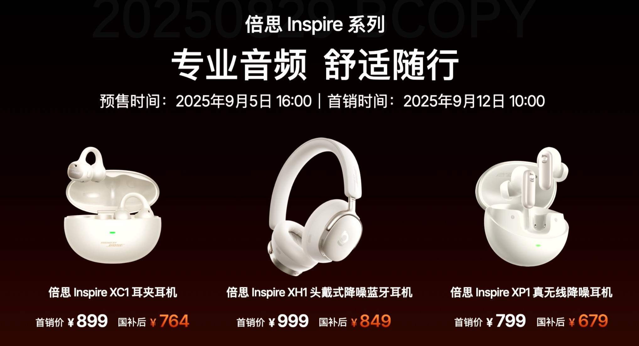 2025年9月5日,全球新生活移动数码品牌Baseus倍思举办线上新品发布会,正式推出年度旗舰音频新品——倍思Inspire系列。该系列是倍思与国际音频与降噪技术引领者品牌Bose深度战略合作的成果,将Bose六十年来积累的声学架构、专业音频调校等核心技术融入其中。倍思Inspire系列的三款新品,不仅是倍思音频过去十年探索的里程碑,也承载着其未来“让专业音频,走向大众生活”的品牌使命。新品定价799元起,打破了高端音频市场的价格壁垒。