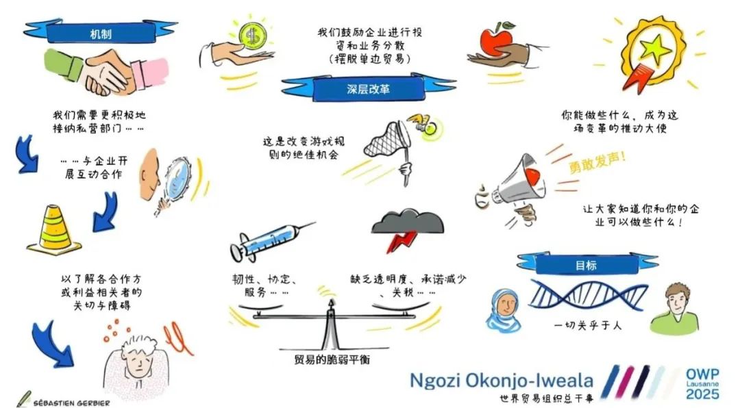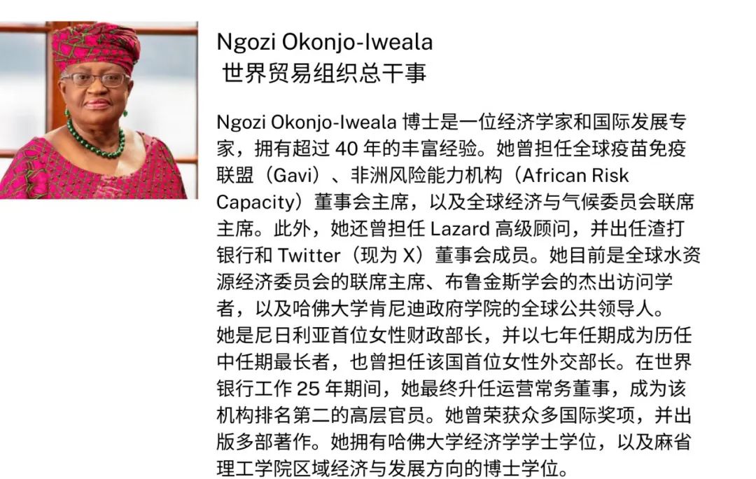 世贸组织(WTO)总干事Ngozi Okonjo - Iweala强调:面对贸易分裂的威胁,越来越多人开始意识到维护基于规则的合作体系的真正价值,商界同样可以为此贡献力量。