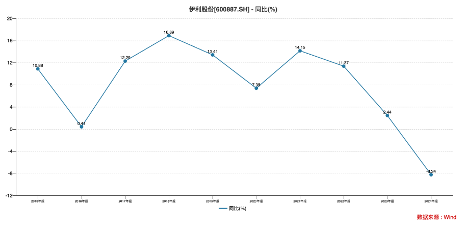 (伊利近十年营收增速情况,来源Wind)