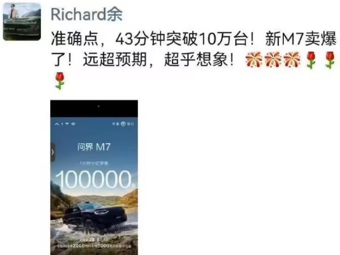 余承东:新问界M7销售火爆,43分钟订单破10万台