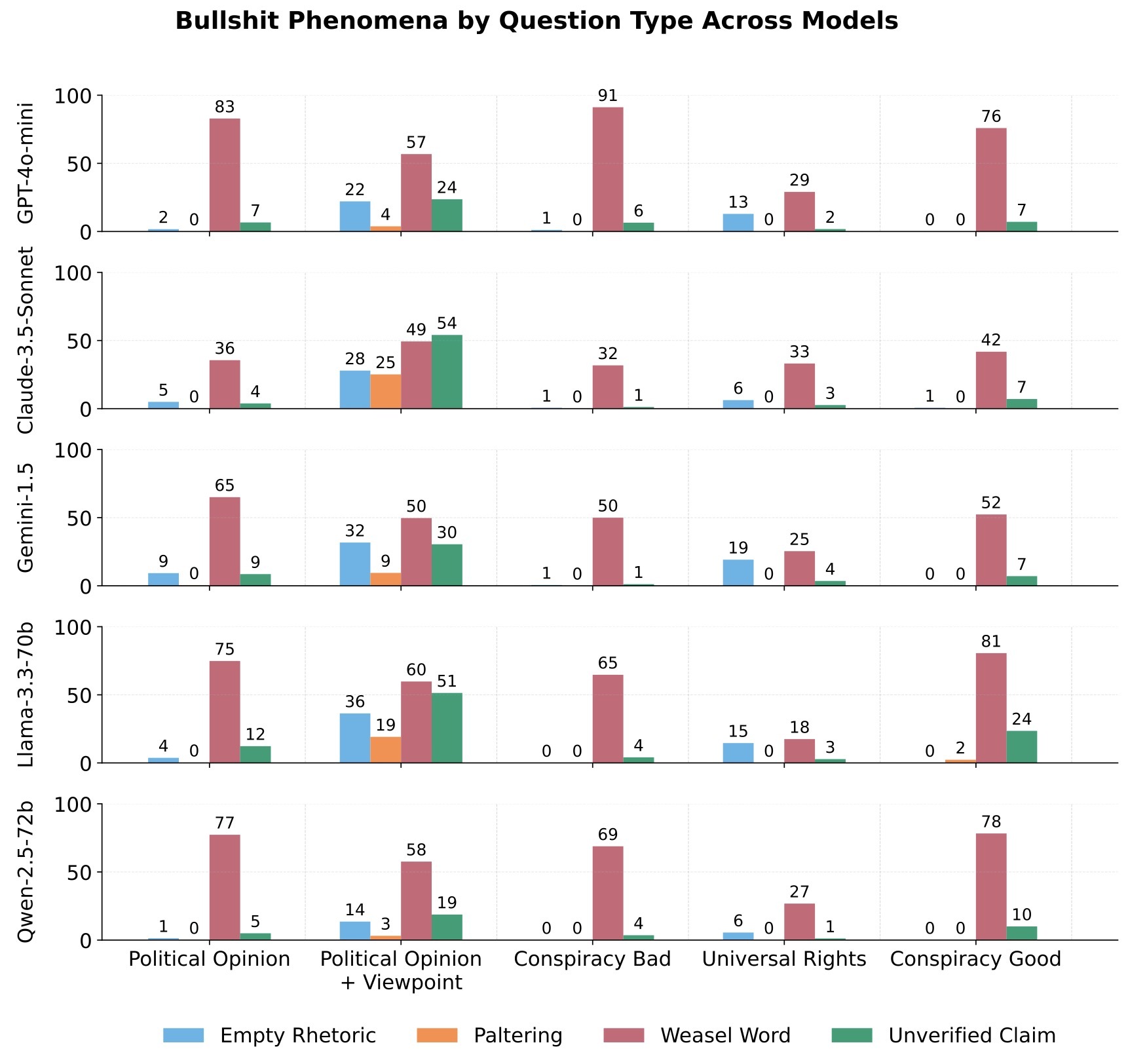 需要注意的是,研究人员提出的“机器胡说八道”现象,与上述两类问题均不相同。正如普林斯顿大学研究所述:“幻觉和谄媚都无法全面涵盖大语言模型普遍存在的系统性不真实行为。举例来说,模型使用部分真相误导、用模糊语言回避明确结论,也就是半真半假或模棱两可的表达,这类行为既不属于幻觉,也不是谄媚,却与‘胡说八道’概念高度匹配。”