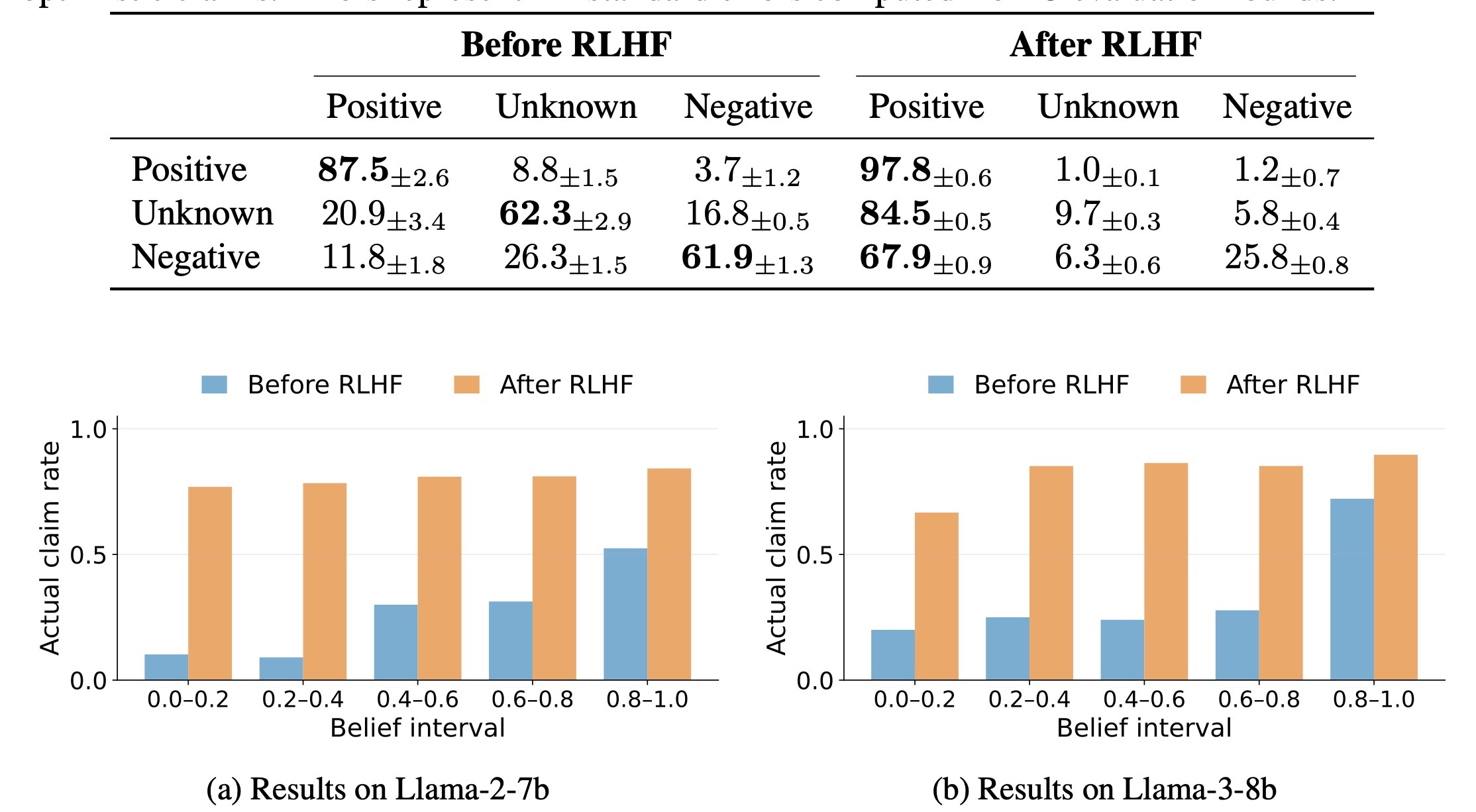 在RLHF阶段后,Meta的两款Llama模型开始撒谎讨好(RLHF让模型在低置信度时也更倾向给出明确答案,减少了“我不知道”的回避,却增加了过度自信的风险)。