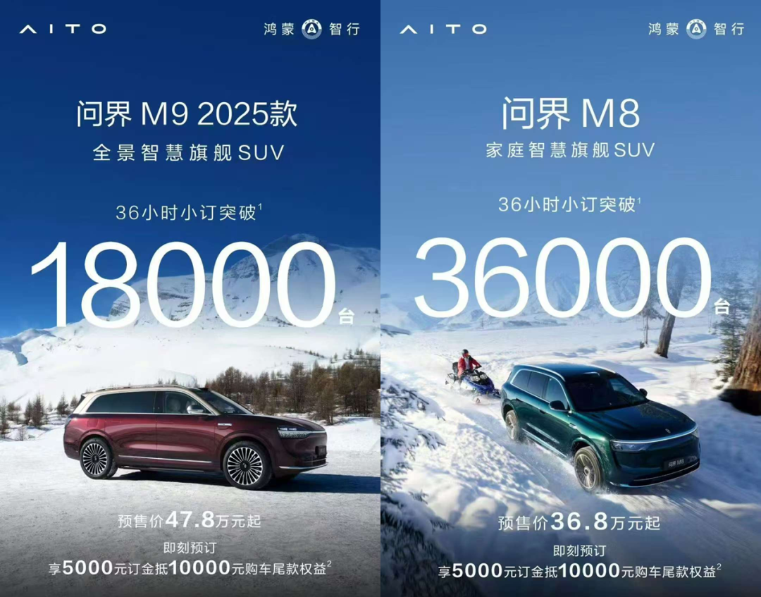 此外,为拉高转化率,小订价格通常会高出一两万,正式上市后降价两万,能拉爆首月订单量。这种套路已成中国汽车行业的常见操作,但问界M7为何格外突出?这就涉及第二个原因:问界M8、M9带来的品牌光环。