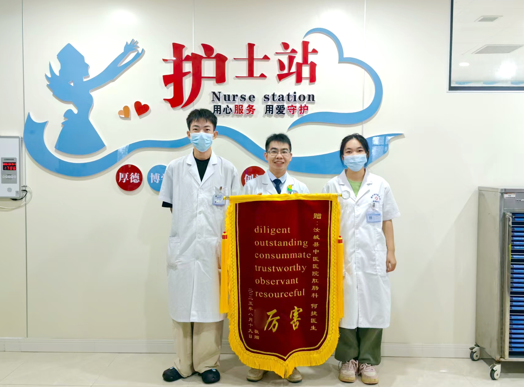 2025年9月4日,汝城县中医医院外二科(肛肠科)办公室里,一面印着英文的锦旗十分醒目,上面写着“diligent outstanding consummate trustworthy observant resourceful......厉害!”。这面跨越语言的致谢锦旗,来自48岁热水镇患者李某满一家,背后是一段中西医结合治愈20年顽疾的温情医患故事。