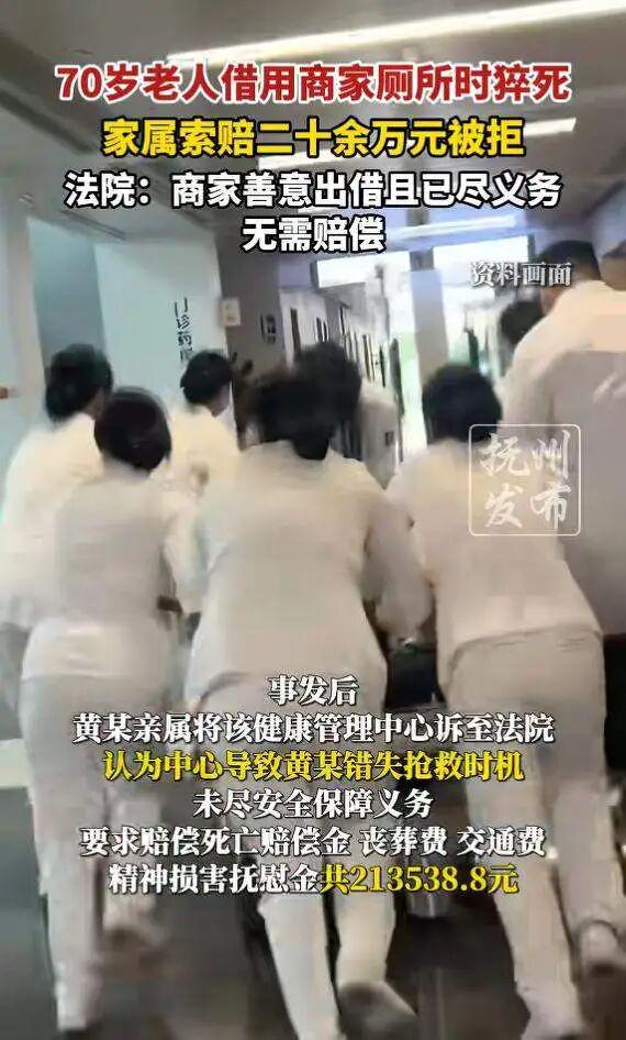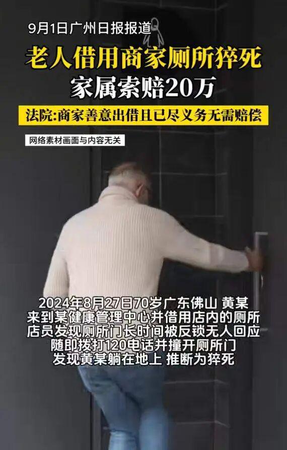 据澎湃新闻报道,2024年8月,70岁老人黄某到广东佛山某健康管理中心借用厕所,之后老人在厕所中猝死。于是,亲属向该中心索赔213538.8元。不过,一审、二审法院均驳回了家属所有诉请。法院认为,中心经营者和店员在发现老人如厕时出现异常后,及时拨打120、撞门查看,已尽到了合理限度的安全保障义务。无偿出借厕所属于“好意施惠”行为,如果没有重大过失且已经尽到合理义务,不应当承担责任。