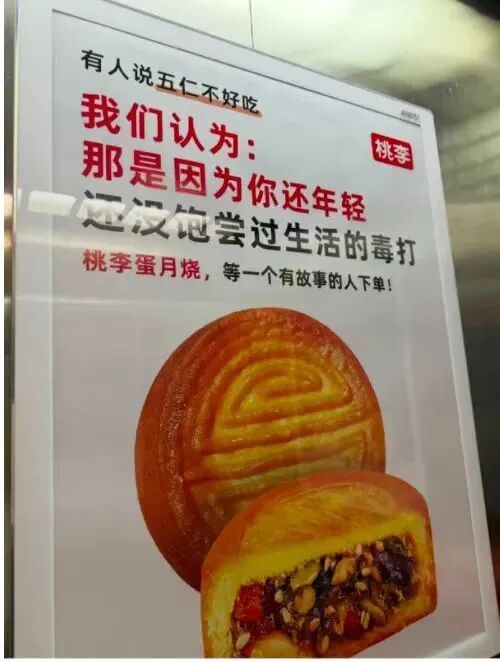 据红星新闻报道,近日,桃李面包(603866.SH)的一则电梯广告文案引发了争议。社交平台上流传的图片显示,桃李蛋月烧产品的广告语为:“有人说五仁不好吃,我们认为:那是因为你还年轻,还没饱尝过生活的毒打。”这一广告语引发了网友的吐槽,有人认为这是“用别人的痛苦做营销”,还有人表示不理解“买月饼为什么要遭受生活的毒打”,也有网友觉得桃李面包这次营销“翻车”,还“教育”起了消费者。