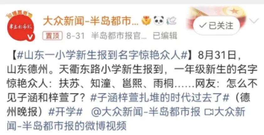 近日,全国多地中小学迎来开学季。部分一年级新生报到时,他们的名字引发广泛关注,相关话题登上热搜。据德州日报消息,山东德州某小学一年级学生自我介绍时,名字一个比一个惊艳,像扶苏、知潼、邕熙、雨桐等。山东东营某小学的新生名字同样备受瞩目,如佳蕤、琮文、安浔、沅泉等。网友纷纷评论,‘子涵、梓轩扎堆的时代过去了’‘这感觉像是打开了一本古风小说’。