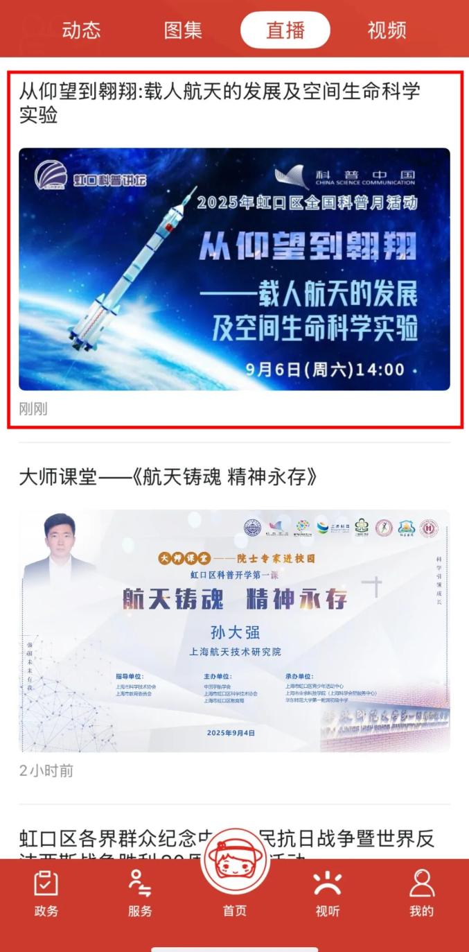 ②在APP“视听”板块找到“直播”,点击进入该场直播