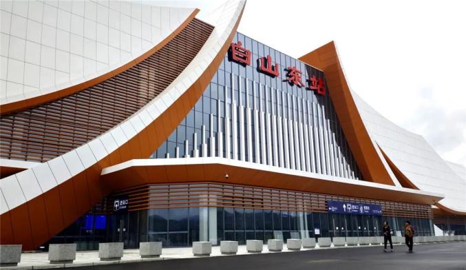 “皑皑长白下,郁郁雪林中”。白山东站以长白山为原型,融入名山、秀水等元素,两侧采用白色曲面叠级幕墙,形似覆满白雪的长白山。