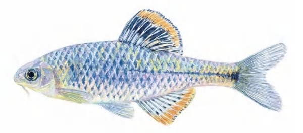 光唇鱼是山区溪流常见鱼种,在徽州一带很多。幼体多在浅滩活动,容易获取,成年后则在水深激流的中下层游弋,反应敏捷,徒手用普通网具很难捕获。像这样壮年期的雄性光唇鱼,如果不用钓具,在水中更难抓到。它和幼年期萌态不同,壮年期以霸气取胜,身形稳健壮实,体色对比强烈,上深下浅,背部从头至尾泛绿。和幼体的斑马纹不同,一条冷深色从体侧中部贯穿头尾,除尾鳍草绿外,背鳍、胸鳍、腹鳍、臀鳍都染成红色。特别是背鳍,第一根棘刺冷黑,红底子下,鳍条之间不规则地涂抹着冷深色块,与体两侧的横纹相呼应。厚实的吻部,除了一上一下各一对触须外,角质状泛白的追星很引人注目,从眼眶处开始直至吻部前端,追星一颗一颗逐步变大。仔细观察会发现,这是雄性光唇为争斗准备的利器。每颗追星,无论大小,在圆饼状基部结构上有顶端尖锐细长的圆锥体,环绕一圈的追星让其吻部像古代兵器狼牙棒。看来,水底世界充满争斗与凶险。雌性光唇相对温和,保留了幼体时的斑条花纹,只是花纹更窄,体侧中间一条深色横线把背部下来的纵纹连接起来,黑色纹路从尾柄通过鳍条延伸至尾鳍,体色对比和鱼鳍色泽表现也温和很多。