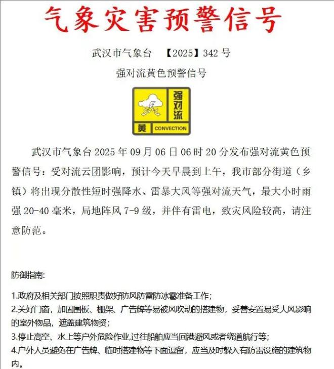 今天(9月6日)早上,武汉发布强对流黄色预警信号。